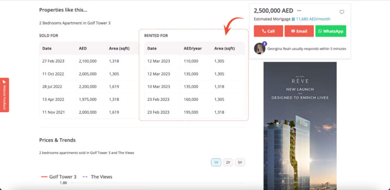 Additionally, to know if you’re getting a bargain or being overcharged, it’s crucial to know how much similar houses or apartments cost in Dubai. So check the Sold For Table below each listing which includes the selling price for similar properties.