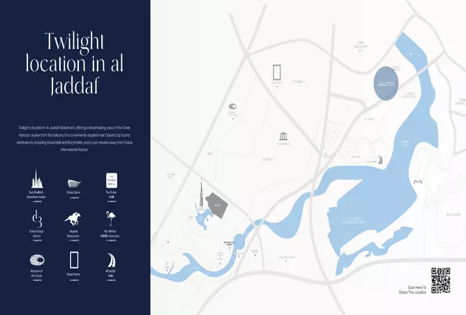 يقع توايلايت في منطقة الجداف الغنية ثقافيًا، ويضم عنوانًا رئيسيًا يوفر إطلالات جميلة على خور دبي من كل منزل. نمت المنطقة بمرور الوقت لتصبح موقعًا مهمًا من الناحية السكنية والتجارية. وهي تتمتع بسهولة الوصول إلى المعالم الرئيسية والمؤسسات التعليمية ومرافق الرعاية الصحية، فضلاً عن الوصول السريع إلى وسط مدينة دبي ودبي فيستيفال سيتي ودبي مارينا.