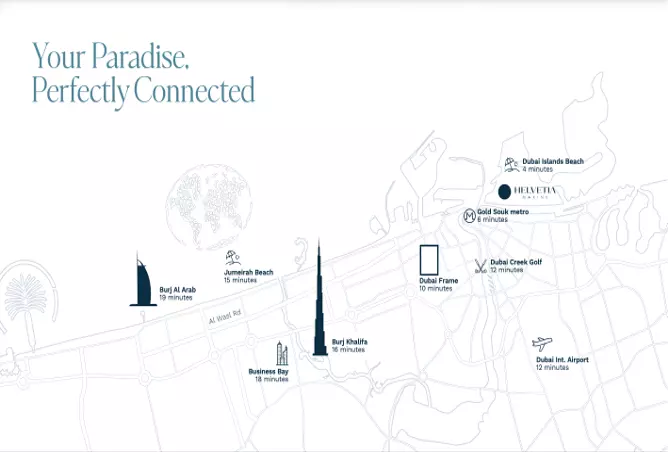 وباعتباره جزءًا من المخطط الرئيسي للمشروع الأكبر، يتمتع هيلفيتيا مارين بموقع استراتيجي على طول الشاطئ الهادئ لجزر دبي، مع تصميم عصري يضم واجهات زجاجية، شرفات واسعة، ومساحات داخلية مفتوحة تستفيد من الضوء الطبيعي. يوفر المشروع أجواءً مميزة بالقرب من المارينا الخاصة، ومساحات خضراء منسقة، مع سهولة الوصول إلى المناطق التاريخية والحيوية في دبي، مما يجعله خيارًا سكنيًا فريدًا يجمع بين الهدوء البحري وسهولة الوصول إلى المدينة.