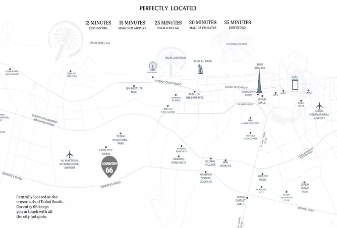 يقع كوفنتري 66 في منطقة مركزية توفر وصولاً سريعًا إلى مناطق الجذب الرئيسية. يقع مترو إكسبو على بعد 12 دقيقة فقط، مما يسهل السفر في المدينة. يمكن الوصول إلى مطار آل مكتوم الدولي في غضون 15 دقيقة، مما يجعله مناسبًا للمسافرين الدائمين والمديرين التنفيذيين للشركات. يقع هذا التطوير على بعد 25 دقيقة من نخلة جبل علي و30 دقيقة من مول الإمارات. يقع وسط مدينة دبي على بعد 35 دقيقة. يجعل الموقع الملائم التنقل اليومي أسهل ويقلل من وقت السفر في عطلات نهاية الأسبوع. يجعل القرب من الطرق السريعة الرئيسية وأماكن الترفيه الشهيرة ومناطق العمل الحياة أسهل للقادمين الجدد وكذلك المقيمين منذ فترة طويلة.