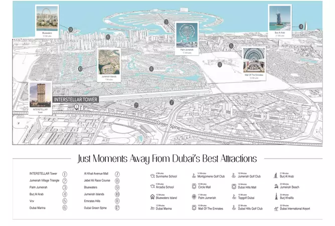 برج إنترستيلار في مثلث قرية جميرا (JVT) هو تطوير من الدرجة الأولى حيث تلتقي الحياة الحضرية بالأناقة، من قبل شركة Mr. Eight Development مع أجنحة حصرية مكونة من غرفتي نوم وثلاث غرف نوم في دبي. يرتفع هذا التطوير الاستثنائي 29 طابقًا، ويعيد تعريف الفخامة مع 236 مسكنًا مصممًا بدقة مع راحة لا مثيل لها. تم تصميم كل وحدة لتوفير راحة لا مثيل لها للسكان، وتتميز بتصميمات فريدة ومفروشات عالية الجودة وإطلالات خلابة على أفق دبي الشهير Bluewaters وMarina. بعيدًا عن المساكن الفاخرة، يعد البرج ملاذًا للاسترخاء والاستجمام، مع نهر على السطح ومساحات خضراء ذات مناظر طبيعية ومرافق حديثة. يدعوك هذا التطوير لتجربة ملاذ حضري حيث تعكس كل التفاصيل التخطيط المدروس، مما يخلق مساحة للاسترخاء وأسلوب حياة المدينة النابض بالحياة.