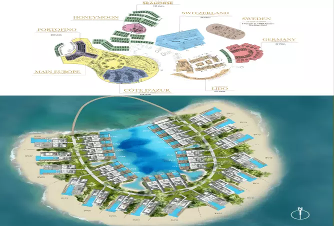 جزيرة ألمانيا هي منتجع فيلا متطور على الواجهة البحرية مستوحى من اندماج مذهل بين تصميم باوهاوس الأنيق وأجواء جزر المالديف البكر. تضم الجزيرة 32 فيلا، كل منها تتكون من طابقين مع تراسات وجدران من النوافذ، مغمورة في حدائق غريبة مورقة مع أشجار نخيل منحنية وتوفر تجربة نادرة على الواجهة البحرية مع اختيار الفيلات المطلة على الشاطئ أو الفيلات المطلة على البحيرة.