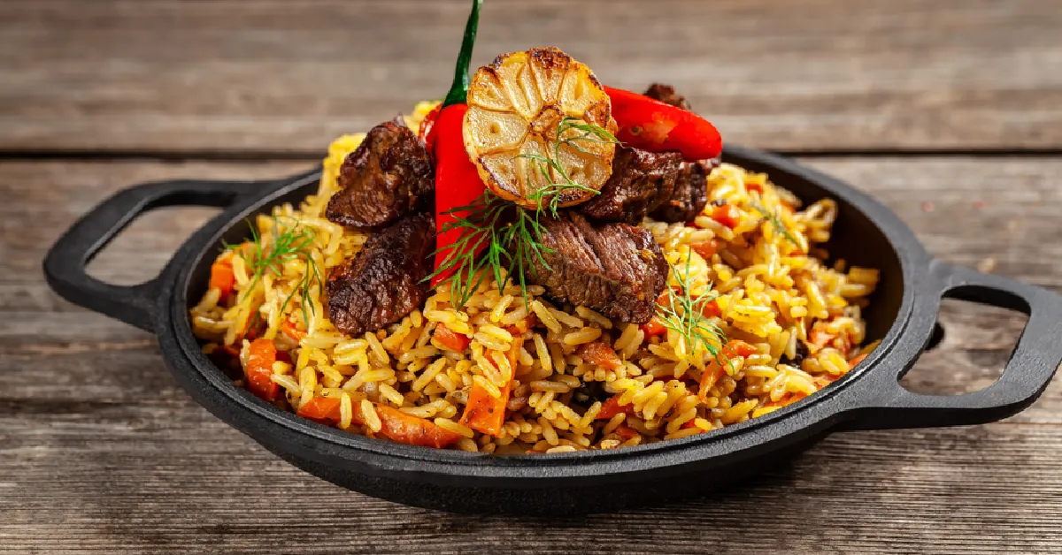 - Aromatic rice: Basmati or similar long‑grain rice, spiced with cardamom, cloves, cinnamon and saffron, cooked in the same pot as the meat to absorb all the juices.