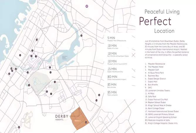 Derby Heights by AMIS presents a serene and stylish collection of 1, 1.5, and 2-bedroom apartments designed for those who seek calm, contemporary living at the heart of Dubai. The open-plan layouts, natural finishes, and floor-to-ceiling windows bring light and harmony into every corner, while panoramic city views frame a lifestyle that feels both peaceful and connected. It is a home that celebrates simplicity, beauty, and comfort in perfect measure.