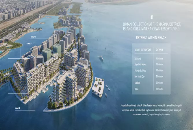 Welcome to Juman 3 at the Marina District in Luluat Al Raha, a coastal neighbourhood wrapped by the water and shaped around its marina and boardwalks. Tree-lined promenades, open views and the 600 m waterfront walkway connect homes to daily resort-style moments, while the location between Abu Dhabi city, Yas Island, Saadiyat and Dubai means island calm with quick access to business hubs, beaches and future attractions such as Disney Abu Dhabi.