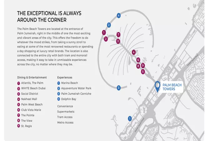 The location of Palm Beach Towers 3 in the city's core allows residents easy access to all of the city's leading attractions. The development's seamless connectivity will appeal to those who want a balance of serenity and city life. The stunning Palm Jumeirah provides a peaceful ambiance despite being close to the busy city.