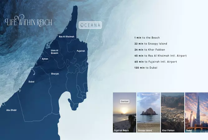 Nestled along Fujairah’s sunlit coastline, Oceana is more than just a residence—it’s a gateway to exploration and investment growth. Its prime location offers direct access to the beach, with Snoopy Island and Khor Fakkan just minutes away. Major airports and city hubs, including Ras Al Khaimah and Dubai, are easily accessible, ensuring seamless connectivity. As Fujairah continues to rise as a leisure and tourism hub, Oceana stands out as a valuable investment opportunity—where modern luxury, natural beauty, and high appreciation potential merge into one timeless address.