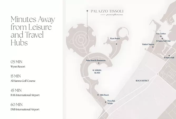 Palazzo Tissoli masterplan by Tissoli is an exquisite waterfront residential development located in the prestigious Al Marjan Island masterplan. As a part of larger project masterplan, this Italian-designed community by Pininfarina offers elegantly crafted apartments that combine modern aesthetics with functional living. The development emphasizes natural light, spacious layouts, and refined interiors inspired by Italian craftsmanship. Residents enjoy a serene environment with panoramic views of the sea, Wynn Resort, and Marjan World, making it a unique destination for luxury living and investment in Ras Al Khaimah. The project also offers a thoughtful mix of communal amenities and private spaces, fostering a vibrant yet tranquil lifestyle.