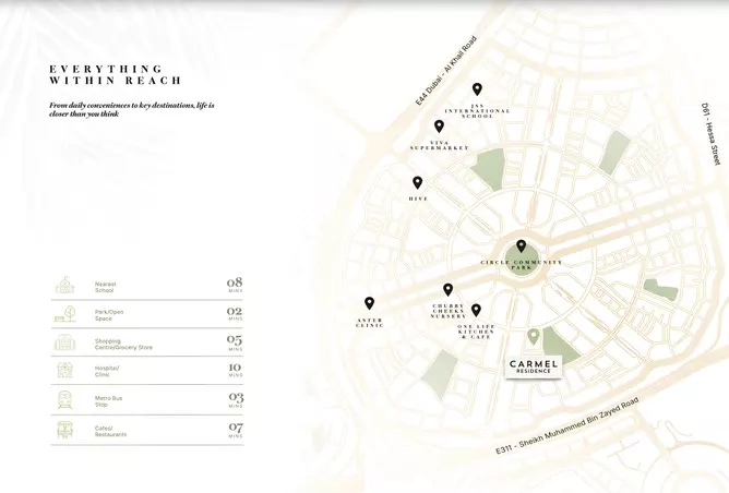 Flexible payment options make Carmel Residence an attractive proposition for buyers and investors alike. Options include a 40/60 post-handover plan spread over five years, along with a 50/50 payment plan, starting with a 20% booking followed by manageable installments. Free chiller service adds additional long-term cost benefits, while the strong rental demand in JVC enhances the appeal of the project as both a home and an income-generating asset.